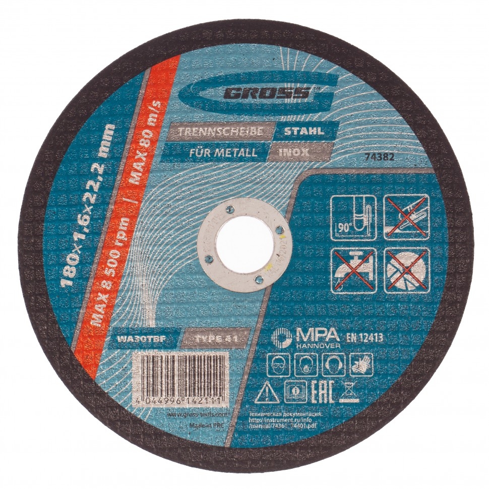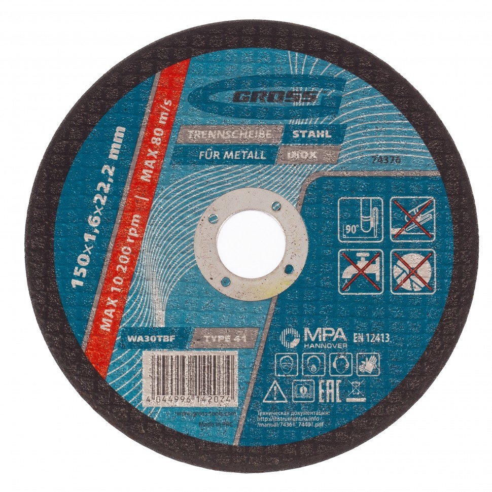 Отрезной круг по металлу Gross WA46TBF 74376, 150 х 1,6 х 22,2 мм, рассчитан на интенсивный сухой рез нержавеющих легированных и углеродистых сталей. Устанавливается на УШМ соответствующего типоразмера. Надежный и производительный, круг подходит для профессиональной эксплуатации с высокими нагрузками. Абразив из монокорунда с добавками &mdash зерно обладает высокой твердостью и прочностью, подтачивается в процессе работы, поэтому эффективность реза не снижается. Очень высокий ресурс в бакелитовую связку и абразив включены специальные добавки. Безопасность работы высококачественная двухслойная стеклосетка защищает круг от перегрузок, предотвращая его разлет в случае зажатия в материале. Специальный состав круг слабо нагревается в процессе реза, износ происходит медленно и равномерно, поэтому образуется минимальное количество пыли и искр. Толщина 1,6 мм и крупный абразив F46 круг обеспечивает высокую скорость и точность реза.