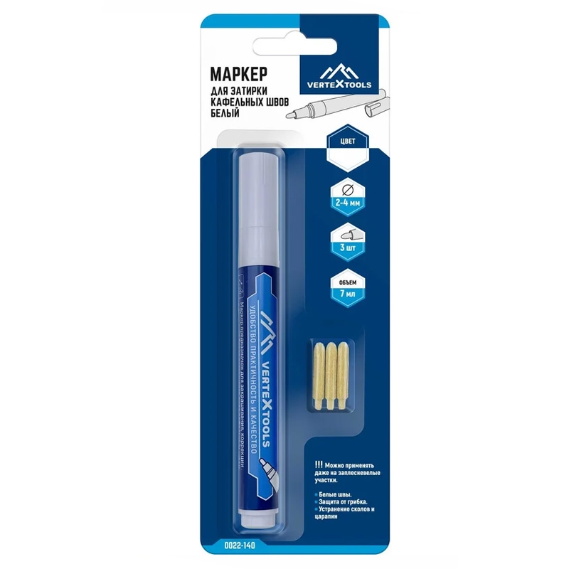 Маркер белый для затирки кафельных швов предназначен для коррекции, закрашивания и предания эстетичного вида кафельным швам. Пердотавращает появление плесени и блокирует проникновение влаги в шов. Имеются съемными наконечники. Финиш после высыхания лаковый. Не имеет запаха. Длина маркера 140 мм.