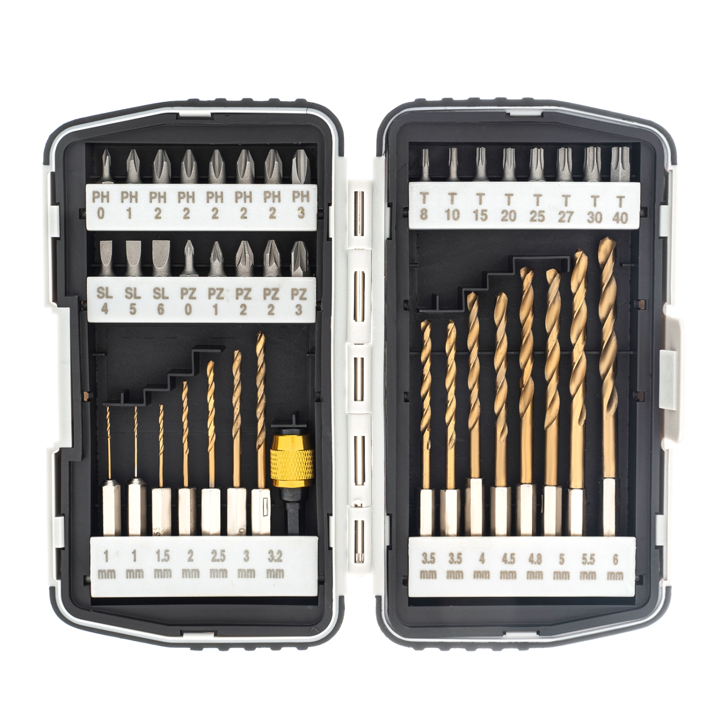Набор Matrix 11322, упакованный в пластиковый бокс, состоит из 40 предметов: бит из стали CrV и сверл с посадочным размером 1/4 дюйма, а также магнитного адаптера. Предназначен для работы с шуруповертами и подходит для решения широкого спектра задач, т.к. включает 24 биты (PH и PZ № 0-3, SL № 4-6, T № 8, 10, 15, 20, 25, 27, 30, 40) и 15 сверл диаметром 1-6 мм. Оснастки применяются для монтажа шурупов и саморезов, а также для сверления отверстий в металле. Прочность и долговечность — биты из хромованадиевой стали выдерживают интенсивные нагрузки.