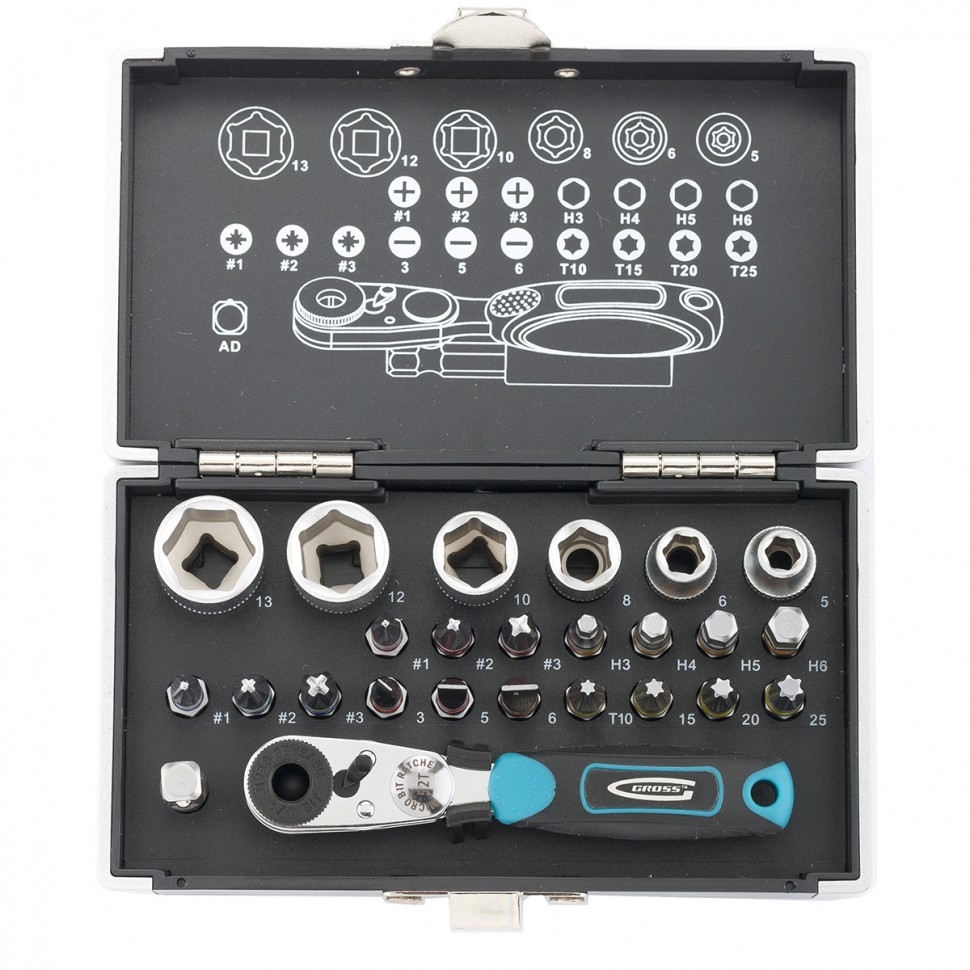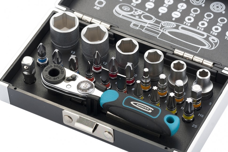 Набор бит и торцевых головок Gross 11361 из стали S2, с посадочным размером 1/4 дюйма, с магнитным адаптером, в пластиковом кейсе, включает в себя 26 предметов для монтажа и демонтажа резьбовых соединений. Применяется при сборке мебели, электроприборов, велосипедов. В комплект входит 17 бит и 6 торцевых головок самых востребованных размеров, миниатюрный ключ-трещотка, удлинитель для бит и переходник с шестигранника на квадрат. Широкая комплектация — набор включает биты Phillips калибров 1-3, Pozidriv калибров 1-3, прямой шлиц SL калибров 3, 5, 6, TORX 10, 15, 20, 25, HEX 3-6 и торцевые головки на 1/4 размерами 5, 6, 8, 10, 12, 13 мм. Высокий ресурс — биты из японской легированной стали S2 твердостью 52-54 HRC и торцевые головки из хромованадиевой стали твердостью 48 HRC обладают повышенной прочностью, износостойкостью и рассчитаны на долгую службу. Работа в труднодоступных местах — компактная трещотка с 52 зубьями особенно актуальна в ограниченном пространстве, где невозможно работать шуруповертом.