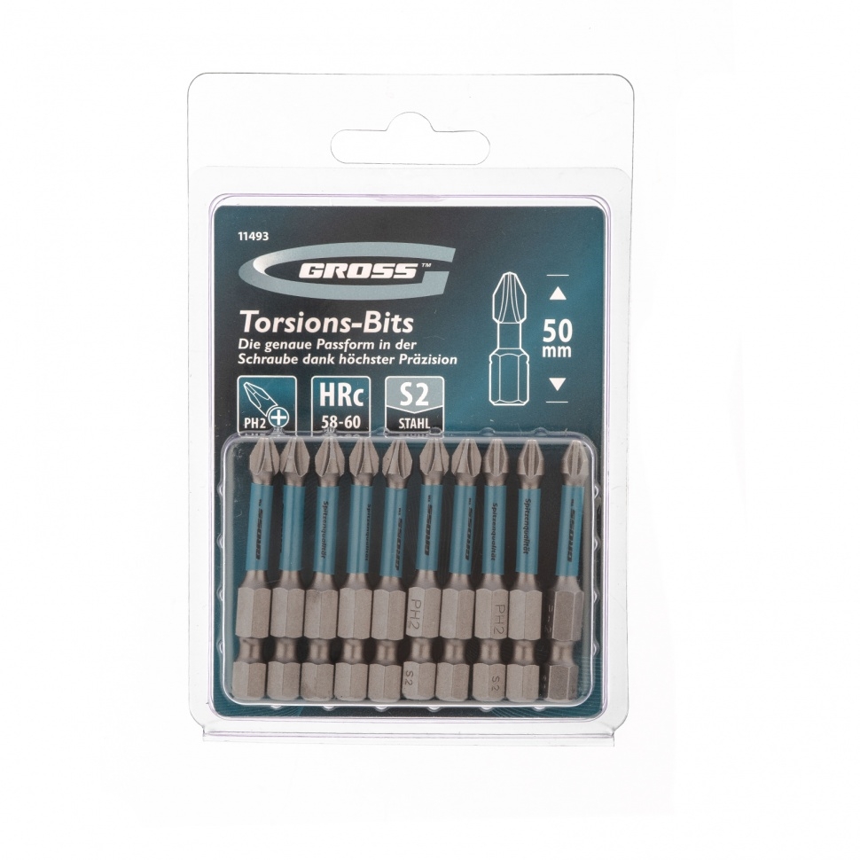 Торсионные биты PH2 x 50 мм Gross 11493, 10 шт., предназначены для монтажа и демонтажа резьбовых соединений с помощью ударного шуруповерта. Они незаменим в строительных, слесарных и монтажных работах, в автосервисах, при проведении ремонта в доме. Торсионная зона способна пружинить, за счет чего она частично амортизирует тангенциальный удар от шуруповерта. Такое решение позволяет равномерно распределить нагрузку по бите и избежать поломки шлица.