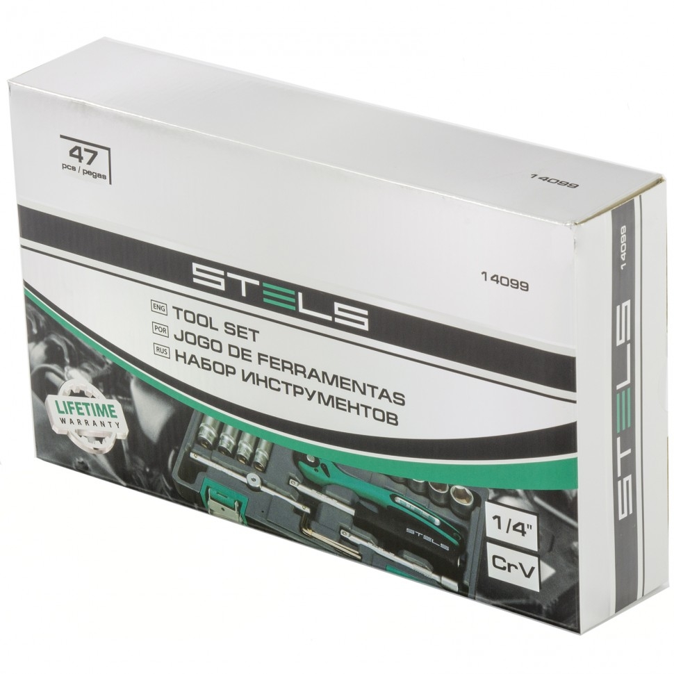 Набор инструментов Stels 14099 в усиленном кейсе включает в себя 47 предметов с хвостовиком 1/4 дюйма из сталей марок CrV и S2. Он применяется для монтажа и демонтажа резьбовых соединений при обслуживании и ремонте авто, а также при выполнении бытовых задач. Инструменты пригодятся автолюбителям и домашним мастерам.Преимущества Трещотка с 72 зубьями вращает крепеж мягко и плавно, что повышает удобство работы. Все детали набора имеют повышенную прочность и износостойкость, т.к. изготовлены из высококачественных марок стали хромованадиевой группы и S2 и термически обработаны Матовое антикоррозийное покрытие надежно защищает инструменты от разрушения. Благодаря эргономичной рукоятке из полипропилена и резины трещотка удобно ложится в руку и не разрушается от воздействия бензина и масла. Механизм быстрого сброса позволяет легко менять насадки на трещотке. Набор поставляется в пластиковом ударопрочном кейсе с металлическими замками, поэтому его легко транспортировать и удобно хранить.