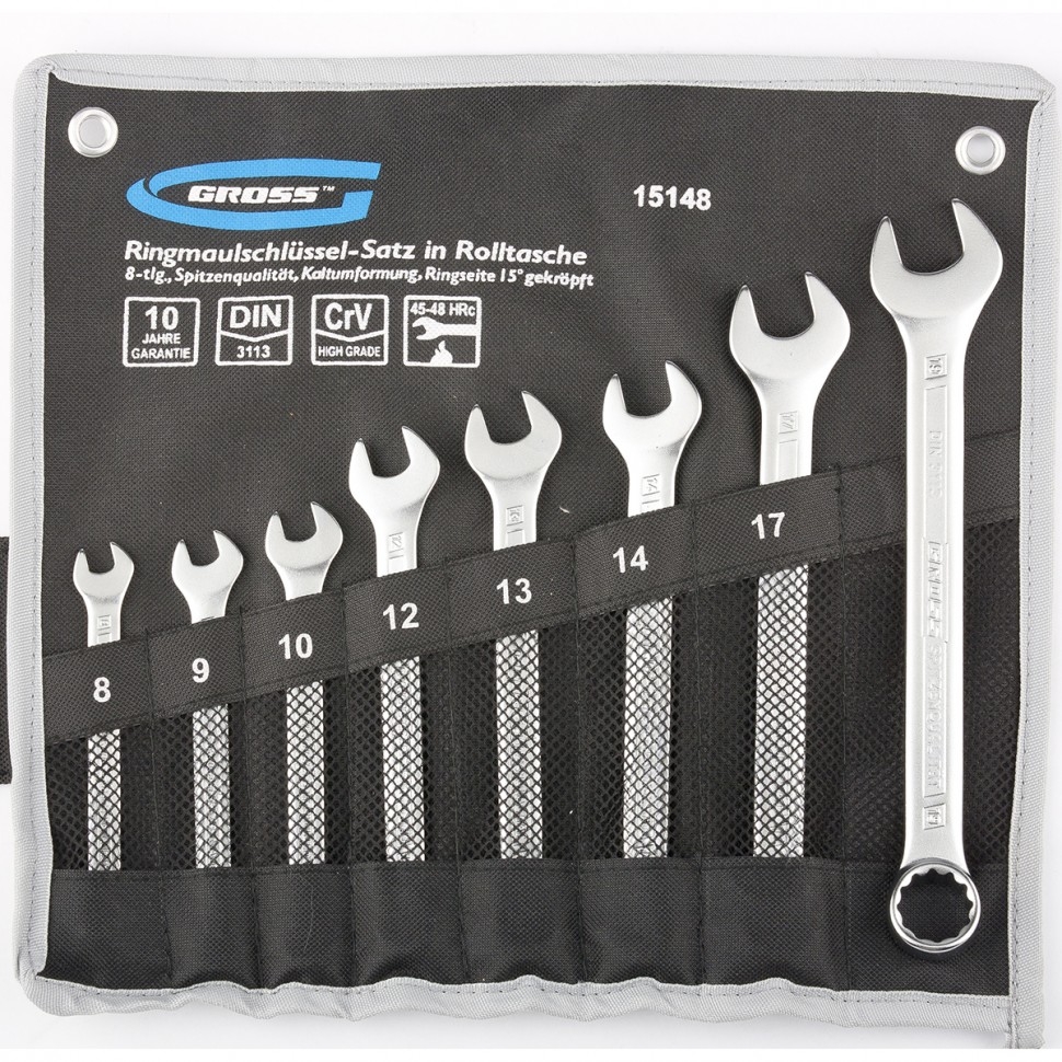 Набор комбинированных ключей Gross 15148 из 8 шт. размером от 8 до 19 мм, холодный штамп, — комплект ручных слесарно-монтажных инструментов из стали CrV, позволяющих закручивать и откручивать гаечные и болтовые соединения. Кольцевой зев каждого ключа имеет 12-гранную рабочую поверхность и крепко удерживает крепеж, не повреждая его. Ключи используются при ремонте автомобилей, сборке техники, будут полезны и в быту.