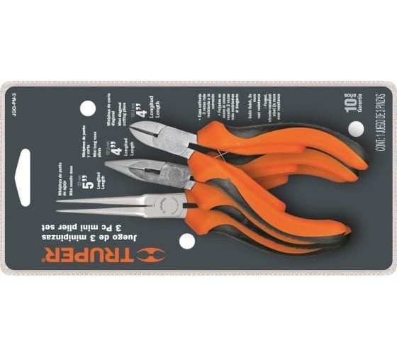 Рабочая часть набора миниплоскогубцев 3 шт Truper JGO-PM-3 18215 выполнена из хромванадиевой стали, стойкой к нагрузкам.