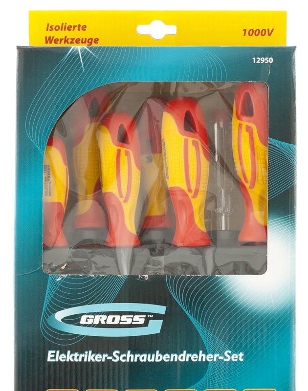 Набор диэлектрических отверток до 1000В, тестер, CrMo, 8шт GROSS 12950 состоит из восьми отверток, одна из которых - тестер напряжения, 3 - крестовые и 4 - плоские. Инструменты полностью соответствуют всем требованиям безопасности. Подходят для выполнения крепежных работ под высоким напряжением до 1000 Вольт переменного тока.