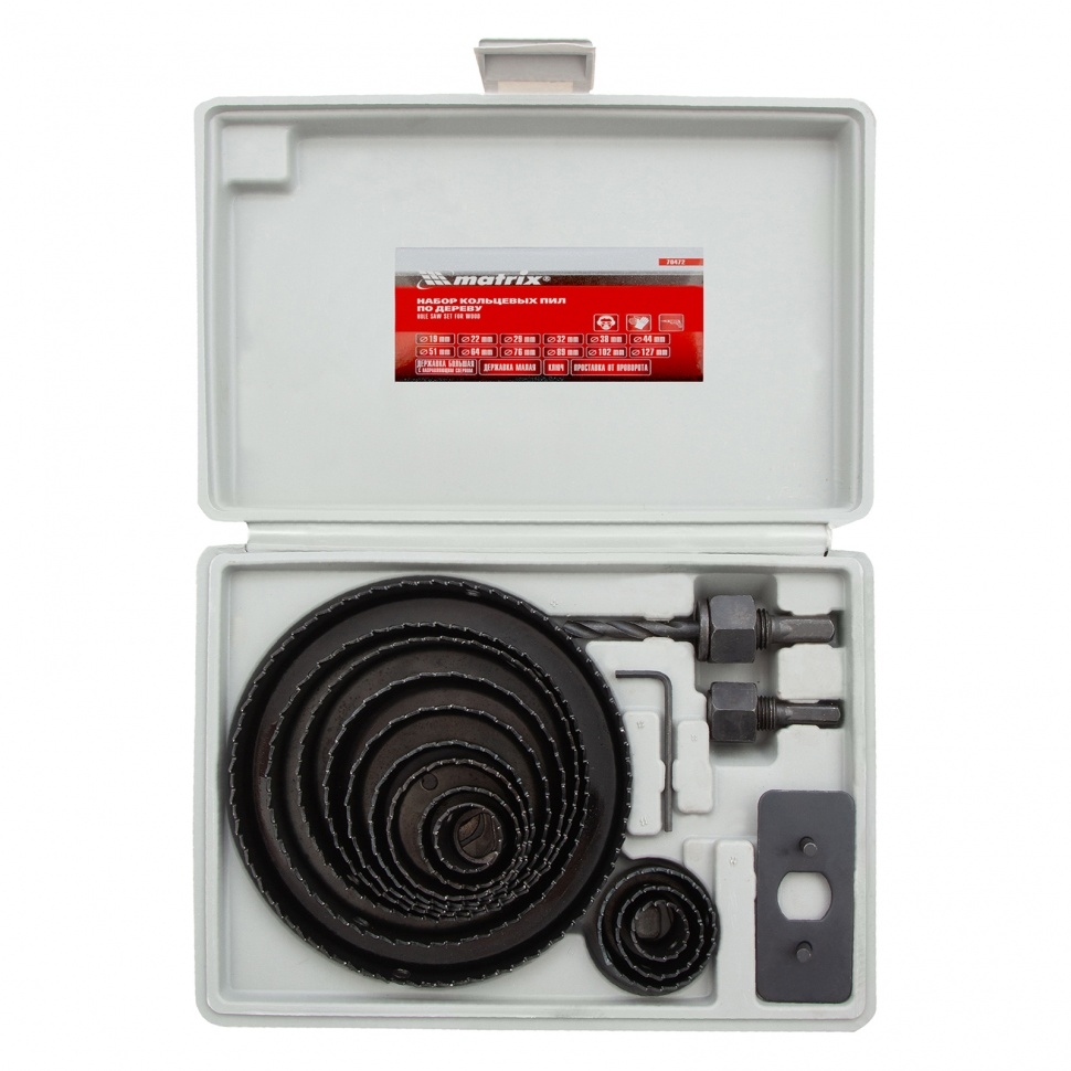 Набор кольцевых пил Matrix 70472 из 12 предметов предназначен для работы по дереву и включает коронки диаметром 19-127 мм. Они устанавливаются на электродрели и служат для выпиливания круглых отверстий в фанере, гипсокартоне, ДСП, ДВП и ламинате. Малая и большая державки облегчают установку пил разного диаметра. В комплекте имеется специальная проставка, исключающая проворот коронки во время сверления. Набор пригодится во время ремонта — с его помощью можно прорезать отверстия под розетки, выключатели, светильники и трубы. Долговечность — кольцевые пилы изготовлены из углеродистой стали, прочной и устойчивой к механическим нагрузкам.