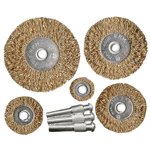 Набор щеток Matrix 74494 состоит из 5 плоских щеток 25-38-50-63-75 мм со шпильками диаметром 6 мм, предназначенных для установки на дрель. Позволяет избавиться от тонкого слоя ржавчины, загрязнений и старых лакокрасочных покрытий. Щетки рекомендованы для обработки углов, пазов, труднодоступных мест на скорости до 4500 об/мин. Преимущества Долговечность — щетина выполнена из высококачественной стальной проволоки. Универсальность — набор подходит для любых твердых поверхностей: древесины, металла, пластика и т.д. Аккуратная работа — щетки с витой щетиной позволяют снять тонкий слой материала. Коррозионная стойкость — корпусы щеток оцинкованы, щетина покрыта латунью.