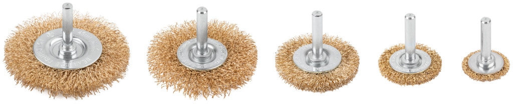 Набор щеток для дрели со шпильками, тип «Плоские», размеры 25, 38, 50, 65 и 75 мм, латунированная витая проволока 0,3 мм, Cutop profi. Предназначена для щадящей очистки различных металлических и деревянных поверхностей, снятия ржавчины, удаления лакокрасочных покрытий и других загрязнений. Тип «Плоская» оптимально подходит для обработки углов, пазов, изгибов и других труднодоступных участков. Упаковка: Блистер.