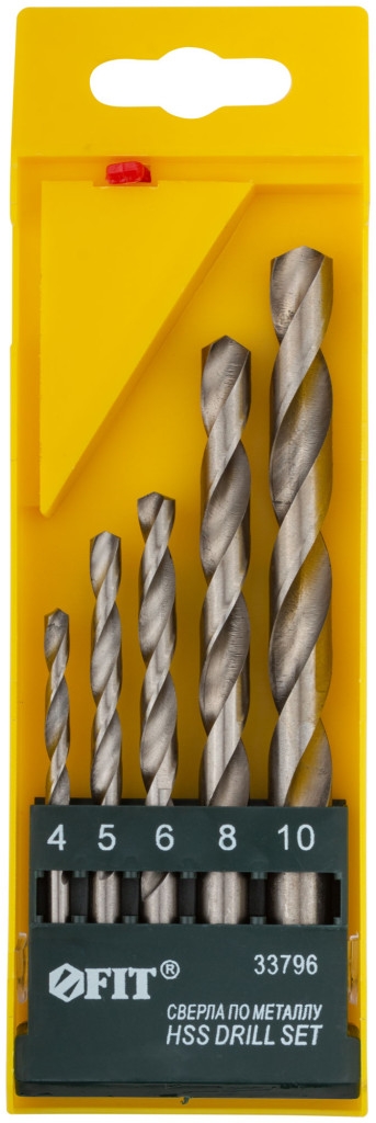 Набор сверл по металлу hss полированных, 5 шт. (4-5-6-8-10 мм). DIN 338. Цилиндрический хвостовик. Полированное. Угол заточки 118°. Класс точности А1. Материал: быстрорежущая (HSS) сталь. Упаковка: пластиковый бокс