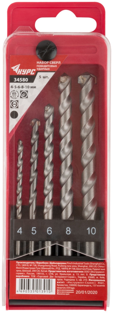 Набор сверл победитовых ударных, цилиндрич.хвостовик 5шт. (4-5-6-8-10 мм) КУРС