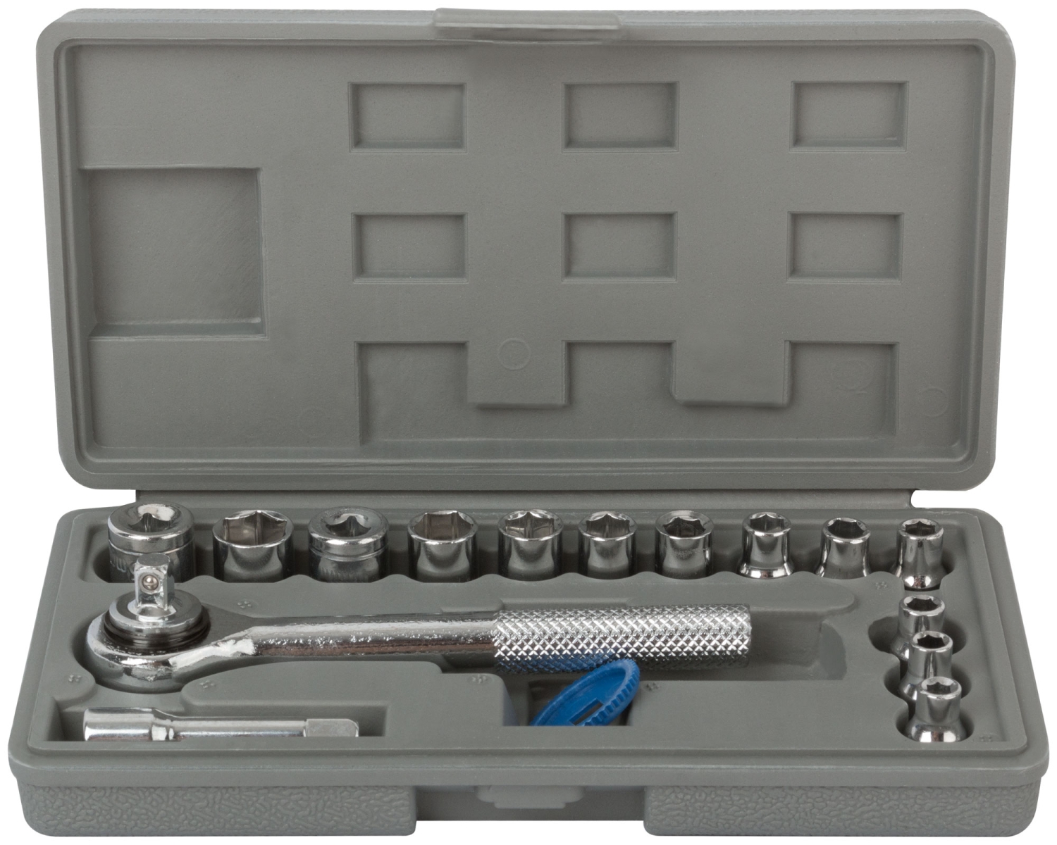 Головки торцевые: 4-4,5-5,5-6-6,5-7,8-9-10-11-12-13мм (1/4"). Вороток реверсивный 125мм (1/4), удлинительм 50мм (1/4-1/4), зубчатый вкладыш для предварительного закручивания, пластиковый кейс.
