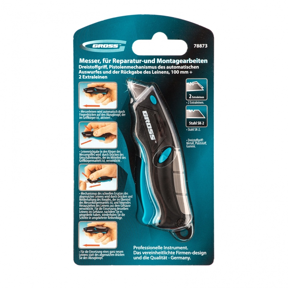 Ремонтно-монтажный нож Gross МИНИ 78873 длиной 100 мм, с трехкомпонентной рукояткой, автоматическим выбросом и возвратом лезвия, с 2 запасными лезвиями, используется для разрезания бумаги, обоев, картона, линолеума, кожи. Прочное трапециевидное лезвие из высококачественной японской стали SK-2 толщиной 0,6 мм и шириной 9 мм не ломается и долго не тупится. Нож рекомендован для профессионального применения, а также будет полезен в быту. урковый механизм — нож приводится в рабочее состояние одним нажатием на курок.