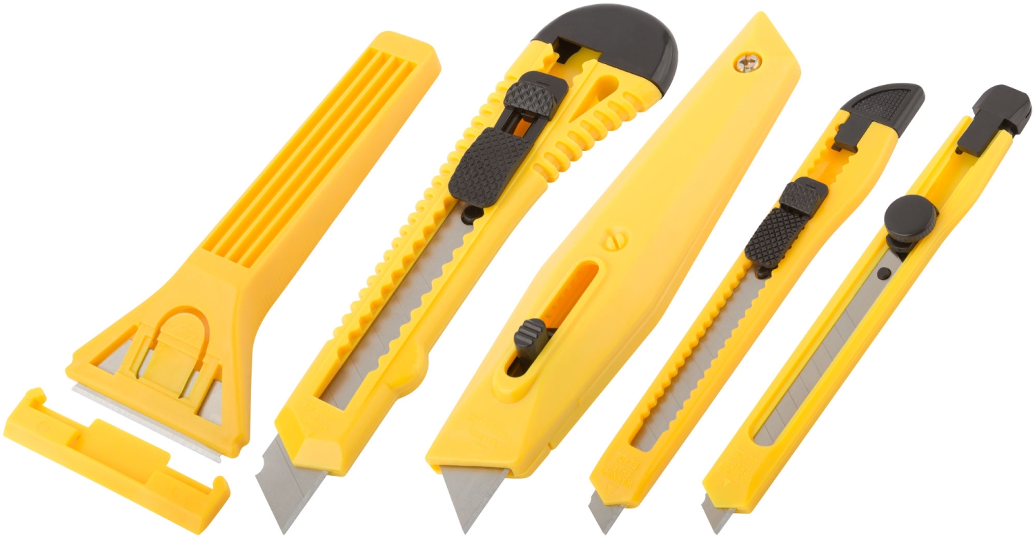 Набор многофункциональный. Для мелкого ремонта. В наборе: скребок стекольный, нож технический (b = 18 мм), нож для ленолиума с трапецивидным лезвием, пластмассовый корпус, нож технический (b = 9 мм) – 2 штуки. Материал: инструментальная сталь, пластик. Упаковка: блистер.