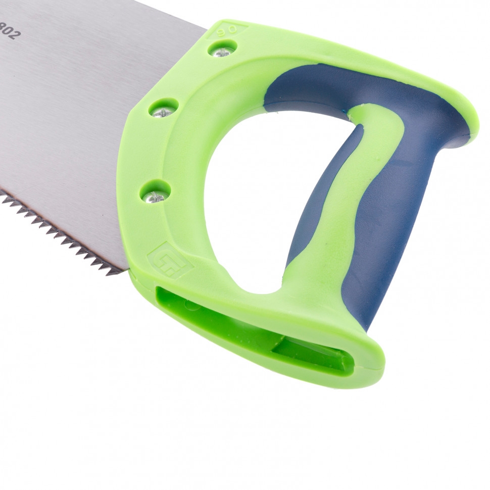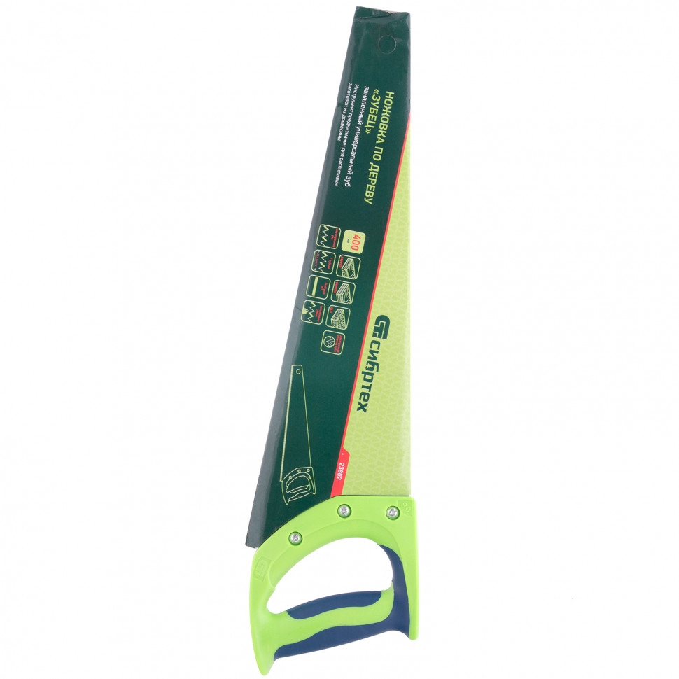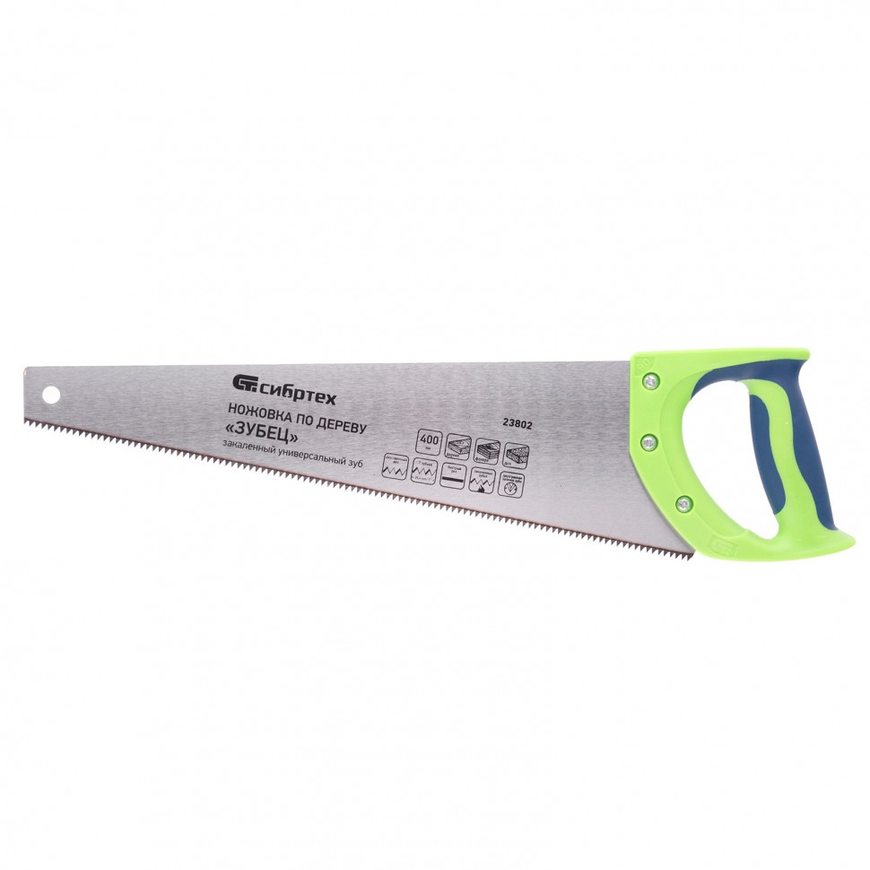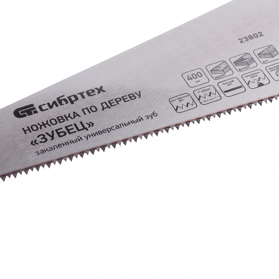 Ножовка по дереву Сибртех «Зубец» 23802 с полотном длиной 400 мм, с калеными зубьями с 2D-заточкой и шагом 7 TPI, с 2-компонентной рукояткой, используется для распиливания заготовок из древесины, фанеры и ДСП. Рабочая часть, содержащая 7 зубьев на дюйм, обеспечивает быстрый двусторонний рез. Режущую кромку можно перетачивать. Ножовка будет полезна столярам, плотникам и домашним мастерам. Преимущества Полотно изготовлено из пружинной стали 65Mn, поэтому выдерживает значительные нагрузки. Зубья прошли закалку, что обеспечивает инструменту высокий ресурс работоспособности. Поверхность полотна покрыта лаком, защищающим ее от коррозии. Рукоятка из ударопрочного пластика прикреплена к полотну 3 винтами, что придает конструкции надежность. Резиновые вставки на рукоятке препятствуют выскальзыванию ее из ладони, что повышает комфортность работы.
