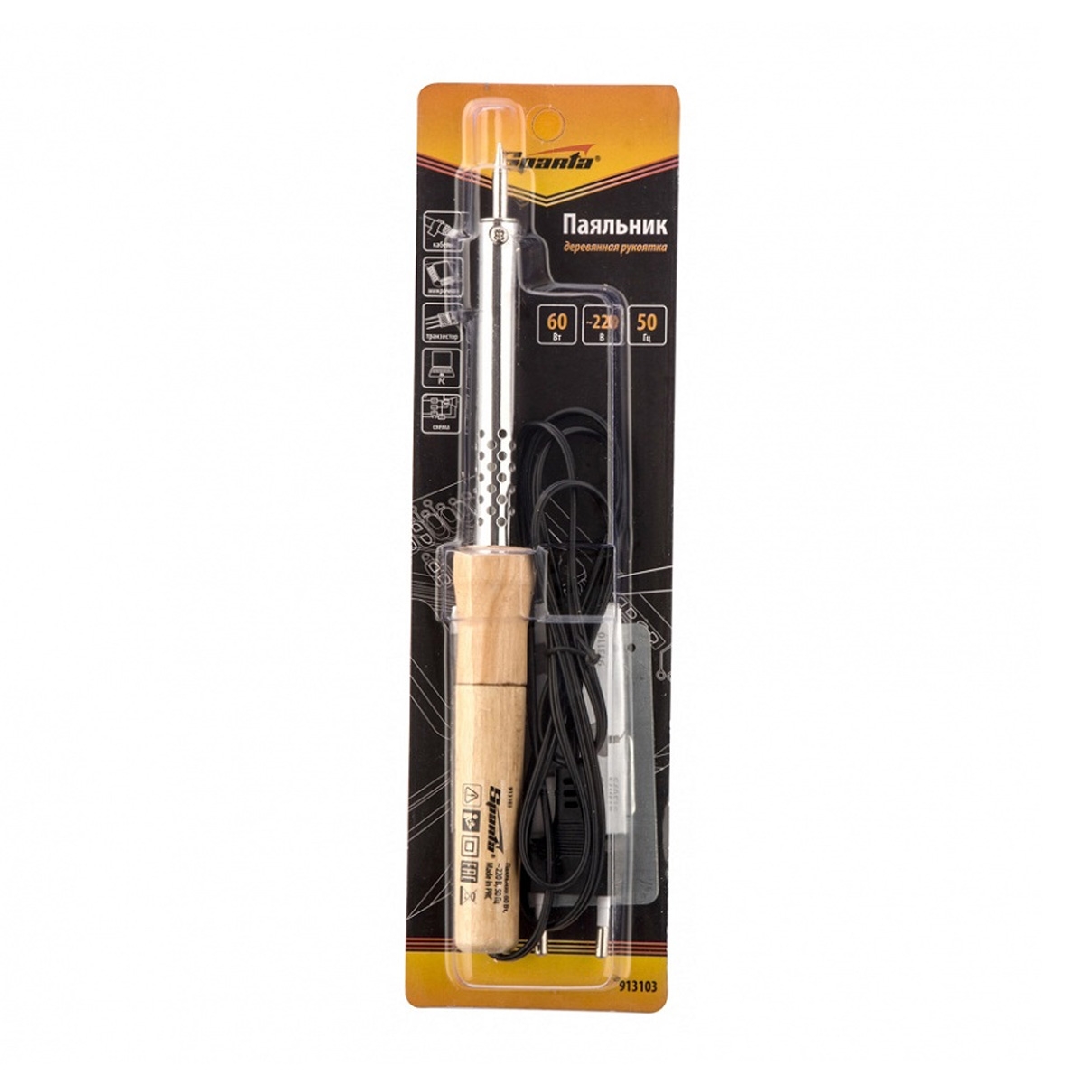 Паяльникс деревянной ручкой 60 Вт, Sparta предназначен для непрерывного нагрева предназначен для пайки электронных схем, электротехнических изделий и электропроводки.