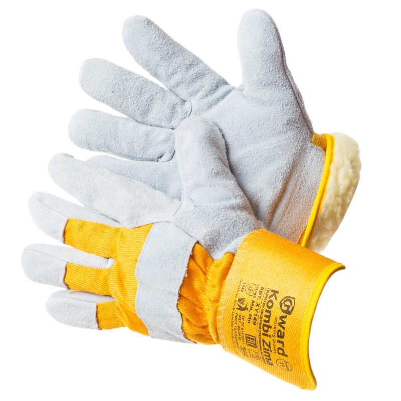 Спилковые комбинированные перчатки. Сшиты из спилка КРС серого цвета и плотной золотистой ткани, прошиты прочными нитями. Дополнительные накладки в районе ногтевых пластин и костяшек тыльной стороны ладони защищают эти места от травм. Для утепления используется подклад из мягкого и плотного искусственного меха "эффект не стриженной овчины" белого цвета. Прорезиненный манжет-крага надежно защищает запястья от внешних повреждений. Спилок высокого качества, плотный, мягкий, устойчивый к истиранию и порезам. Защита от пониженных температур в I-II, III, IV климатических поясах. Защитные свойства - Ми, Мп, Тн