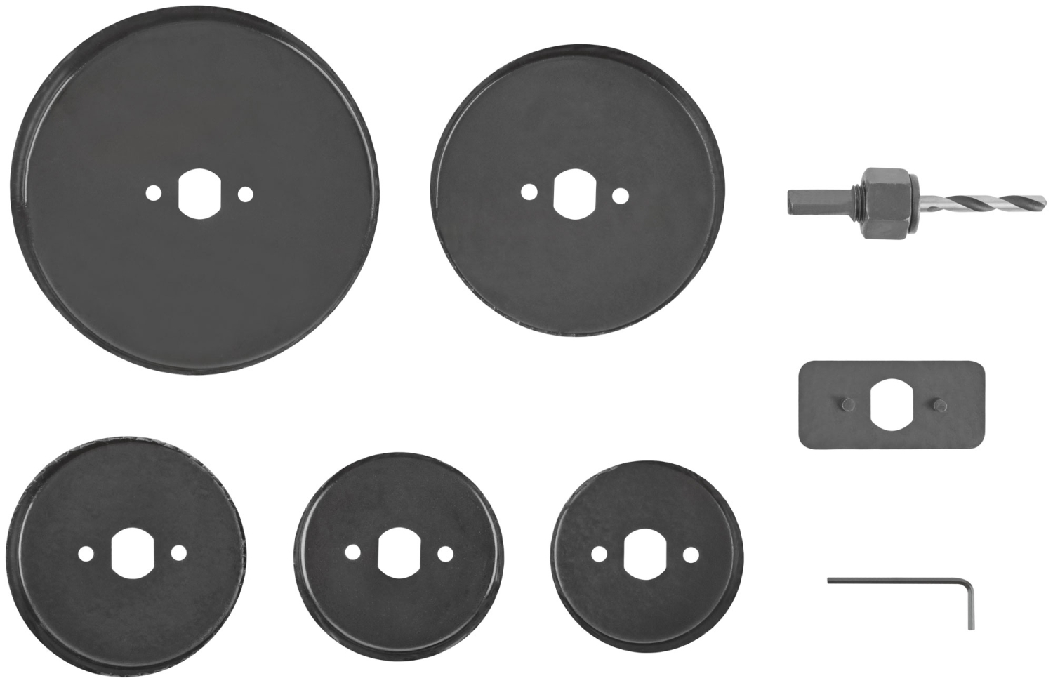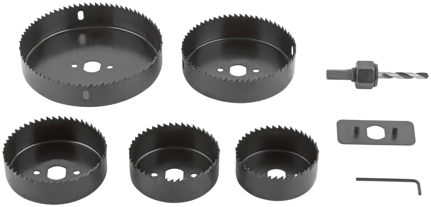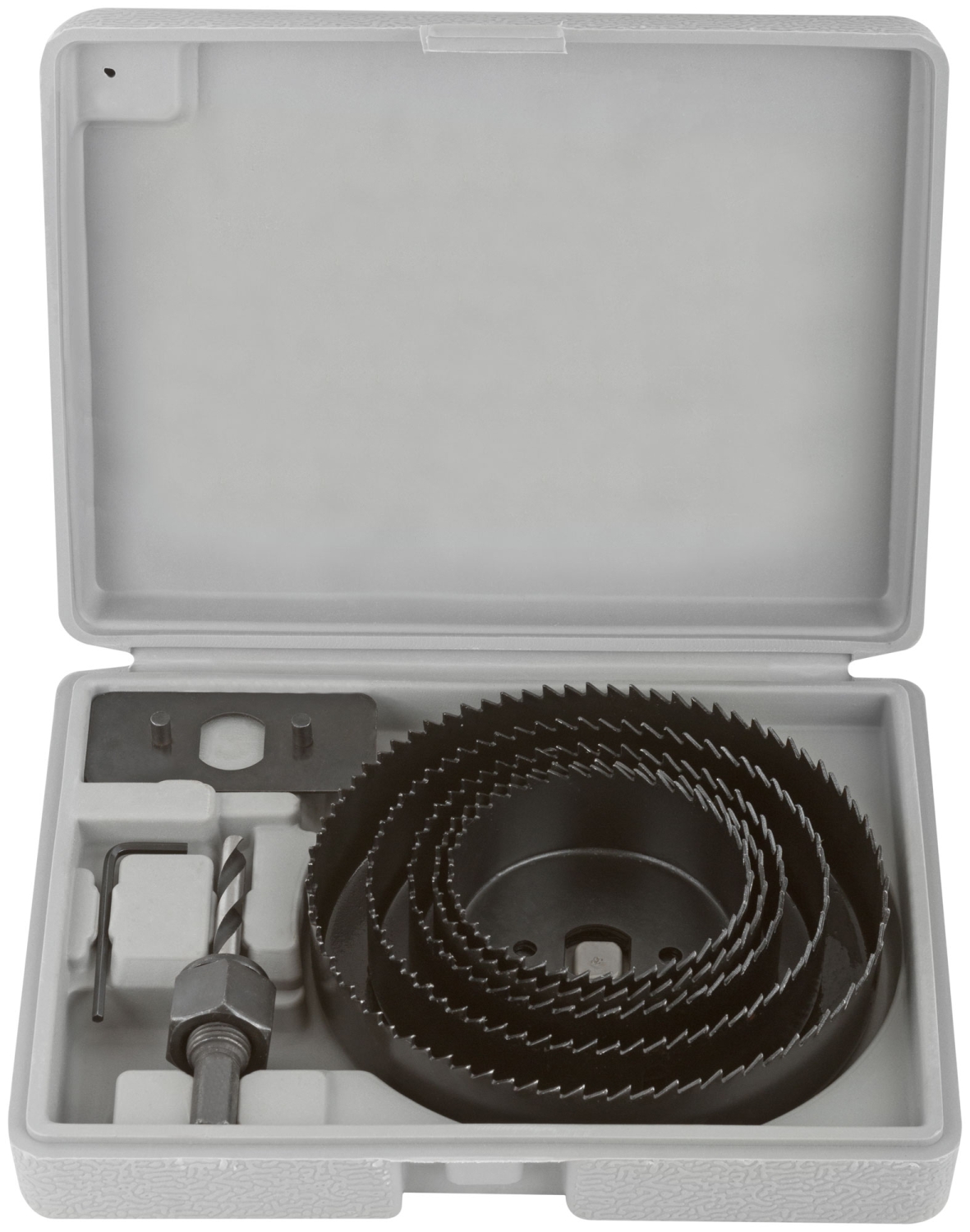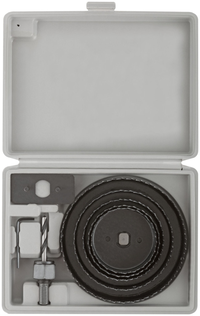Усиленный адаптер. Профи. Для высверливания отверстий в древесине твердых и мягких пород, ДСП и фанере. В наборе 5 пил круговых: 68, 72,,82, 102 и 127 мм. Материал: термообработанная усиленная инструментальная сталь. Упаковка: пластиковый кейс.