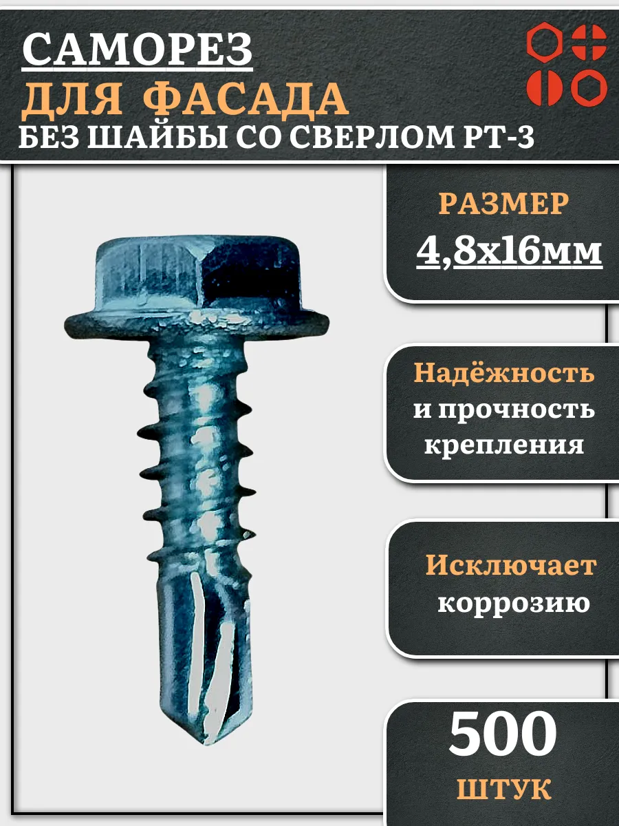 | Саморез без шайбы для фасада со сверлом 4,8х16 РТ-3, 500 шт. | сф4816фф500 | 1 шт. |