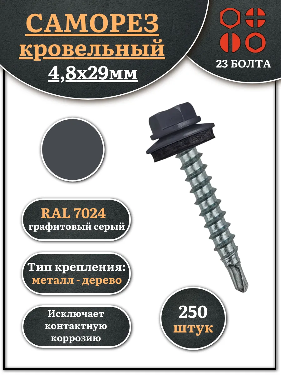 Саморез кровельный, 4,8х29 графитовый серый RAL7024 250 шт