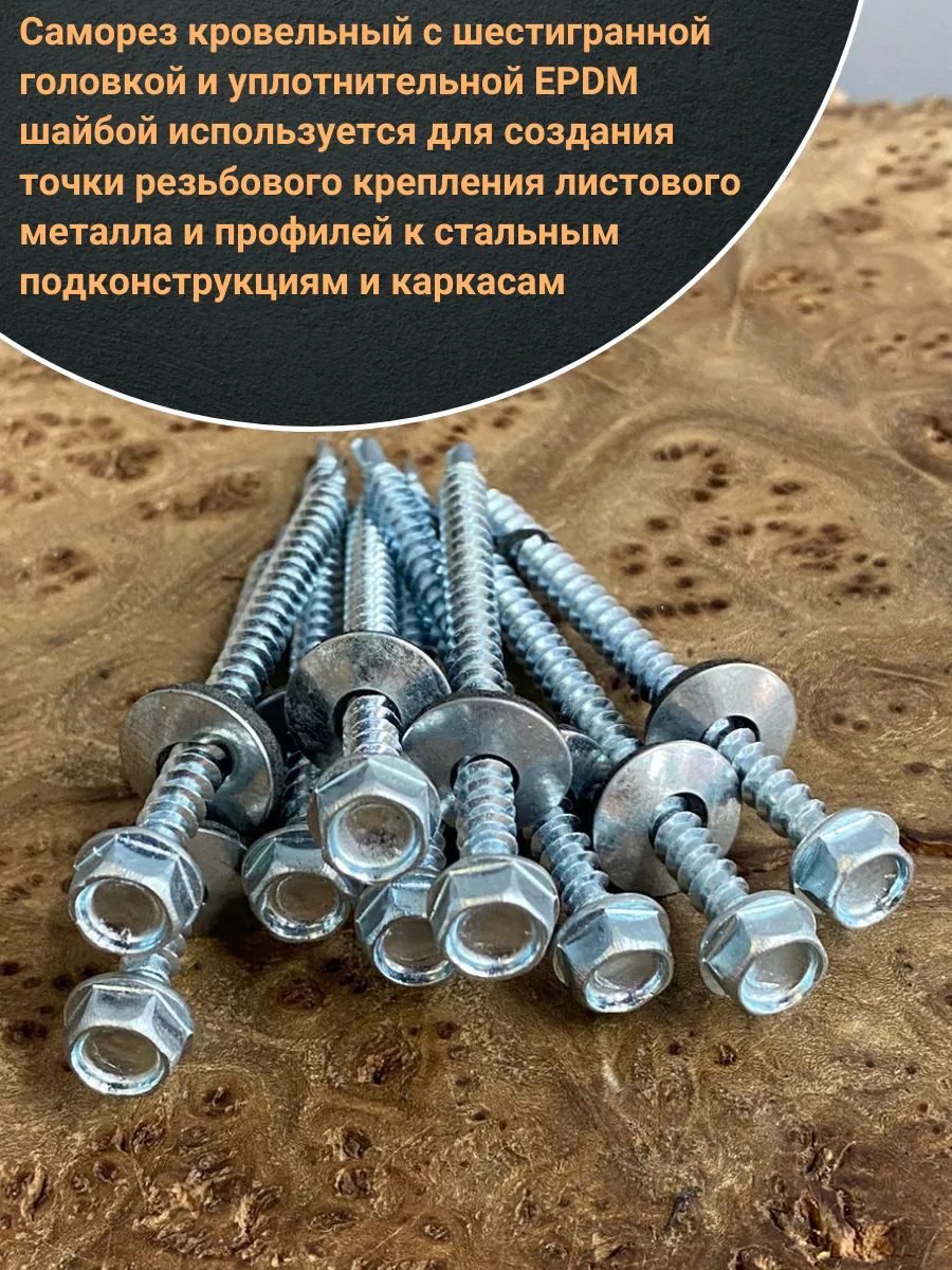 Материал: Оцинкованная сталь Саморез кровельный с шестигранной головкой и уплотнительной EPDM шайбой используется для создания точки резьбового крепления листового металла и профилей к стальным подконструкциям и каркасам. Служит в качестве элемента точечного крепления для водонепроницаемого соединения типа “металл - металл”. Самосверлящий шуруп предназначен для быстрой установки за один этап. Самосверлящий шуруп из оцинкованной стали представляет собой резьбовой элемент крепления для монтажа металлических кровельных покрытий. Шестигранный шуруп оснащен пресс-шайбой интегрированной с уплотняющей прокладкой из синтетического каучука EPDM. Параметры резьбы и форма наконечника самореза в виде сверла максимально адаптированы для крепления кровельного металла к металлическим подконструкциям.