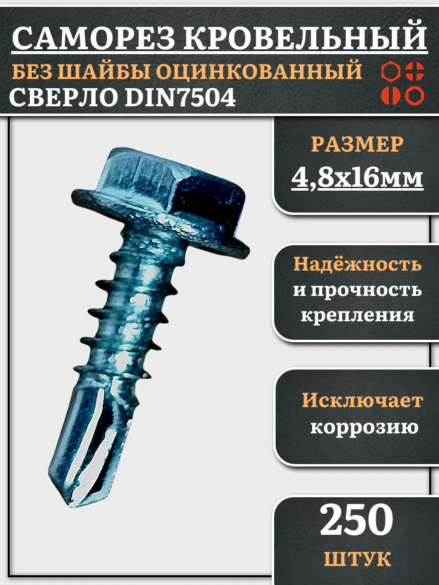 Саморез кровельный без шайбы, 4,8х16 ОЦ сверло DIN 7504, 250 шт.