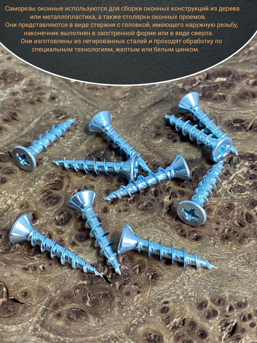 Саморезы оконные используются для сборки оконных конструкций из дерева или металлопластика, а также столярки оконных проемов. Они представляются в виде стержня с головкой, имеющего наружную резьбу, наконечник выполнен в заостренной форме или в виде сверла. Они изготовлены из легированных сталей и проходят обработку по специальным технологиям, желтым или белым цинком.