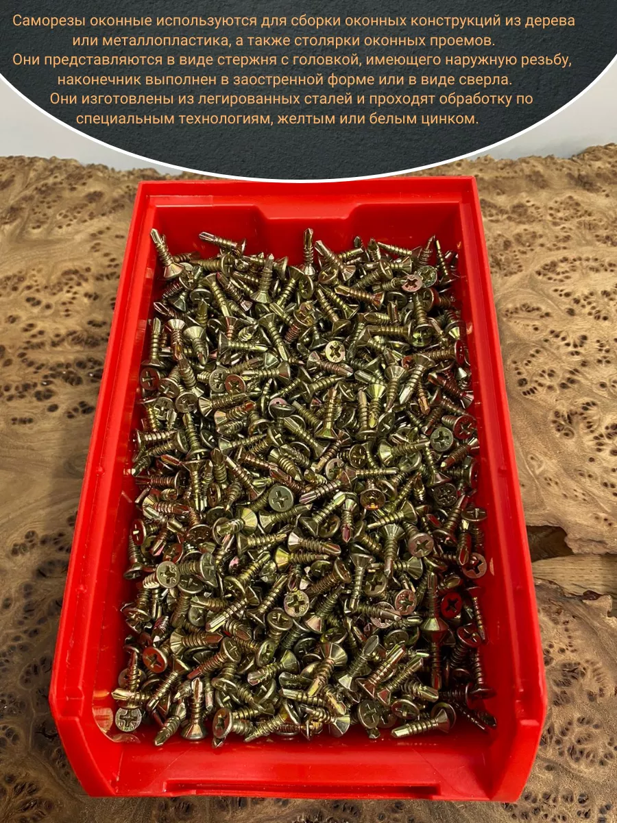 Саморезы оконные используются для сборки оконных конструкций из дерева или металлопластика, а также столярки оконных проемов. Они представляются в виде стержня с головкой, имеющего наружную резьбу, наконечник выполнен в заостренной форме или в виде сверла. Они изготовлены из легированных сталей и проходят обработку по специальным технологиям, желтым или белым цинком.