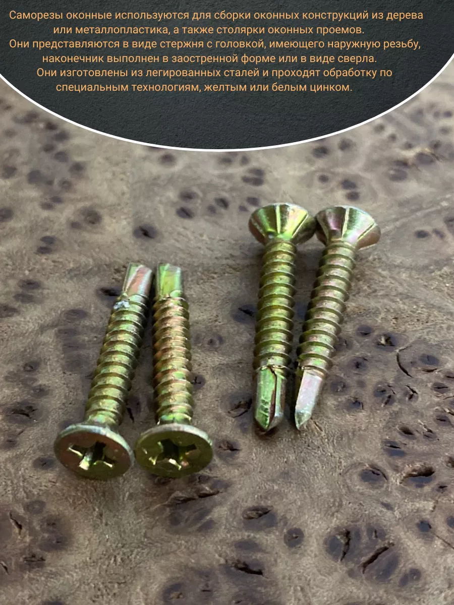 Саморезы оконные используются для сборки оконных конструкций из дерева или металлопластика, а также столярки оконных проемов. Они представляются в виде стержня с головкой, имеющего наружную резьбу, наконечник выполнен в заостренной форме или в виде сверла. Они изготовлены из легированных сталей и проходят обработку по специальным технологиям, желтым или белым цинком.