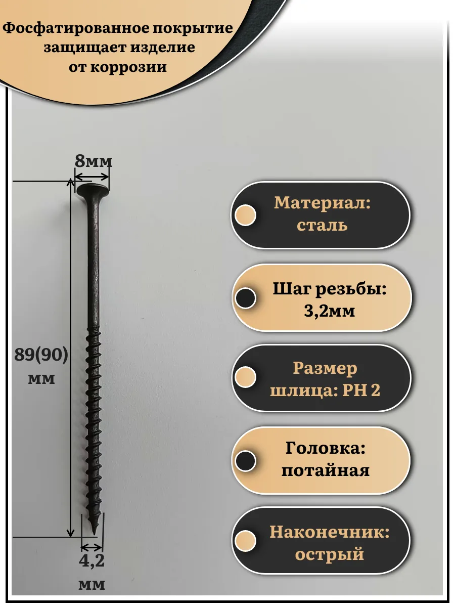Саморез шуруп по дереву 4,2х89(90) крупная резьба, чёрный 1 кг.
