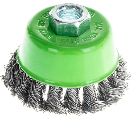 Щетка Сибртех «Чашка» 746247 диаметром 75 мм, с присоединительной резьбой М14, с щетиной из крученой проволоки диаметром 0,5 мм, устанавливается на УШМ, поддерживающую работу со скоростью 12500 об/мин. Изделие предназначено для грубой (черновой) обработки поверхностей и подходит для удаления загрязнений, снятия толстого слоя ржавчины, ЛКМ, зачистки сварных швов.