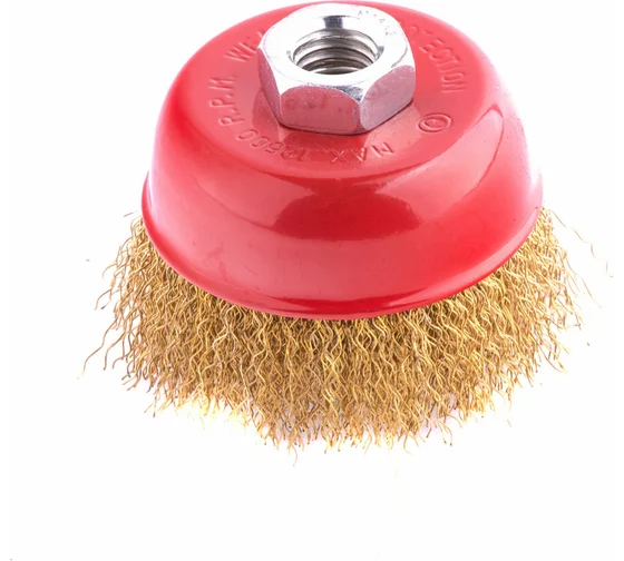 Щетка «чашка» Matrix 74605 диаметром 100 мм, с щетиной из латунированной витой проволоки, устанавливается на вал УШМ с помощью гайки М14. Предназначена для снятия тонкого слоя краски или лака, удаления ржавчины и загрязнений. При рекомендованной скорости вращения 8500 об/мин щеткой можно быстро обрабатывать участки большой площади.