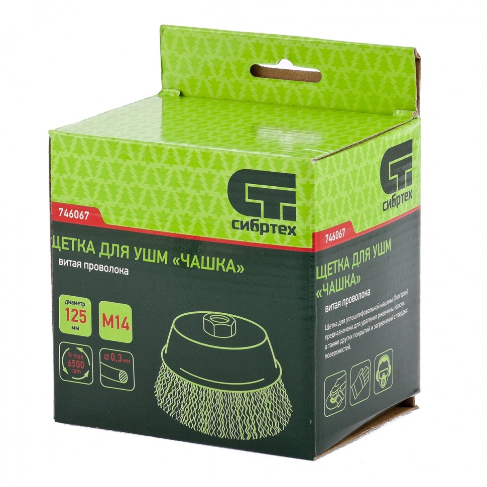 Щетка для УШМ Сибртех «чашка» 746067, М14, диаметром 125 мм, с щетиной из витой проволоки 0,3 мм, предназначена для постепенного снятия тонкого слоя материала с металлических, деревянных и пластиковых поверхностей. Удаляет ржавчину, загрязнения, а также остатки краски и других покрытий. Подходит для обработки участков значительной площади. Щетку устанавливают на вал углошлифовальной машины (УШМ), рекомендуемая максимальная скорость вращения 6500 об/мин. Работать с оснасткой следует в спецодежде. Преимущества Деформационная стойкость щетины — витая проволока принимает исходную форму после снятия нагрузок. Защита от коррозии — корпус покрыт эмалью, а на щетину нанесено техническое масло. Быстрая установка и замена насадки — щетка крепится на вал УШМ при помощи гайки М14.