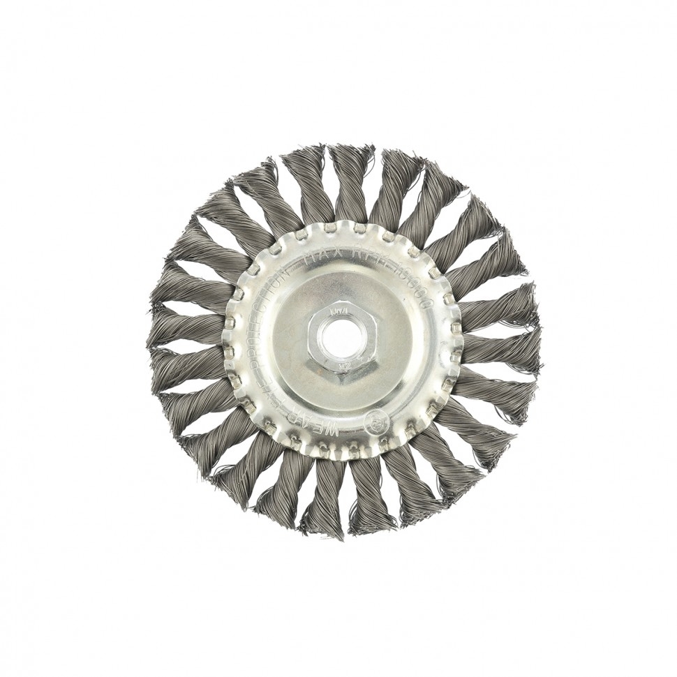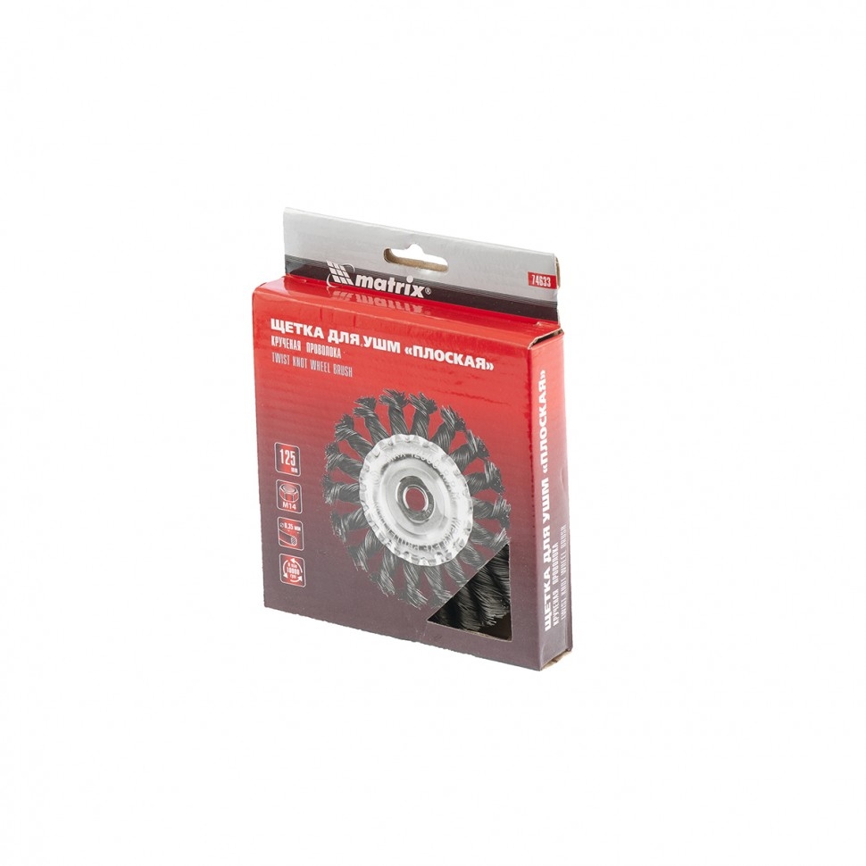 Плоская щетка для УШМ Matrix 74633 диаметром 125 мм, с крученой проволокой 0,35 мм и гайкой М14 используется для грубой (черновой) обработки поверхностей. Она устанавливается в качестве оснастки на УШМ. Благодаря щетке можно снять толстый слой ржавчины, лакокрасочных покрытий, загрязнений, а также зачистить сварные швы. За счет плоской формы ею удобно проводить обработку в труднодоступных местах: углах, изгибах и др. А благодаря щетине 0,35 мм осуществляется менее агрессивная зачистка по сравнению с щетиной 0,5 мм. Эксплуатация щетки допускается на скорости не более 10000 об/мин. Преимущества Щетина из прочной стальной проволоки обеспечивает высокий ресурс щетки. Щетка универсальна и может использоваться для обработки различных поверхностей: металлических, в т.ч. из цветных металлов, деревянных, пластиковых. Щетина обработана маслом, а корпус покрыт цинком для повышения антикоррозионных свойств щетки.
