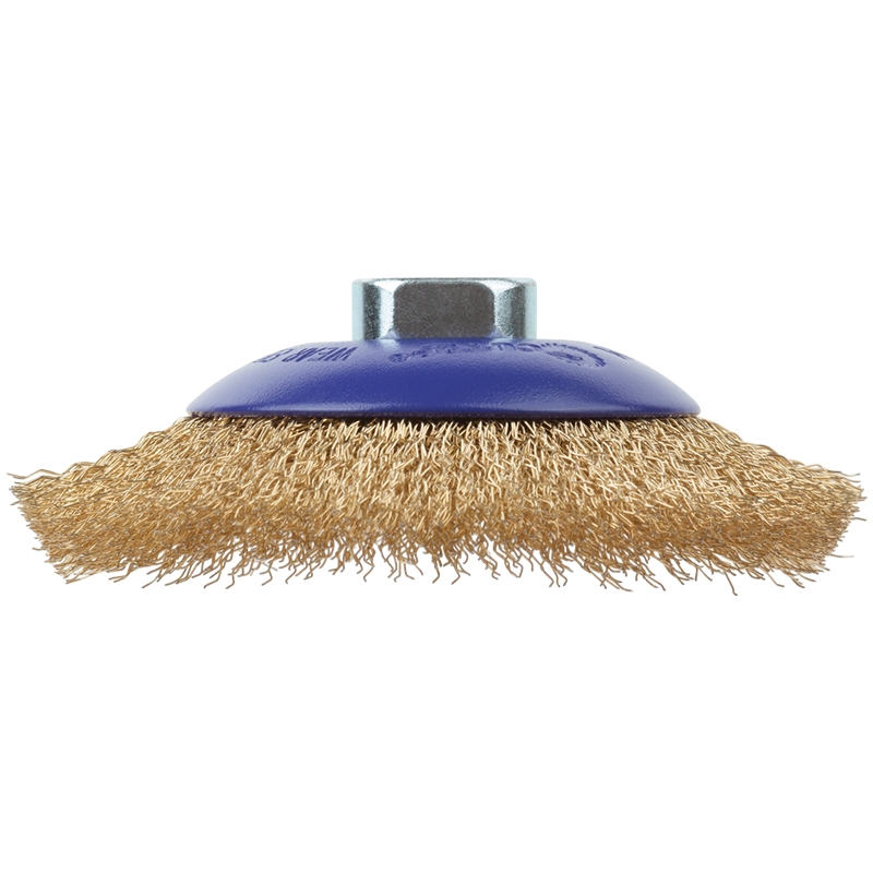 Щетка для УШМ, тип «Тарелка», посадка М14. Предназначена для очистки различных металлических и деревянных поверхностей, снятия толстого слоя ржавчины, удаления лакокрасочных покрытий, заусенцев и окалины, обработки сварных швов, различных загрязнений. Тип «Тарелка» оптимально подходит для обработки углов, пазов, изгибов и других труднодоступных участков. Щадящая зачистка, латунированная проволока 0,3 мм.