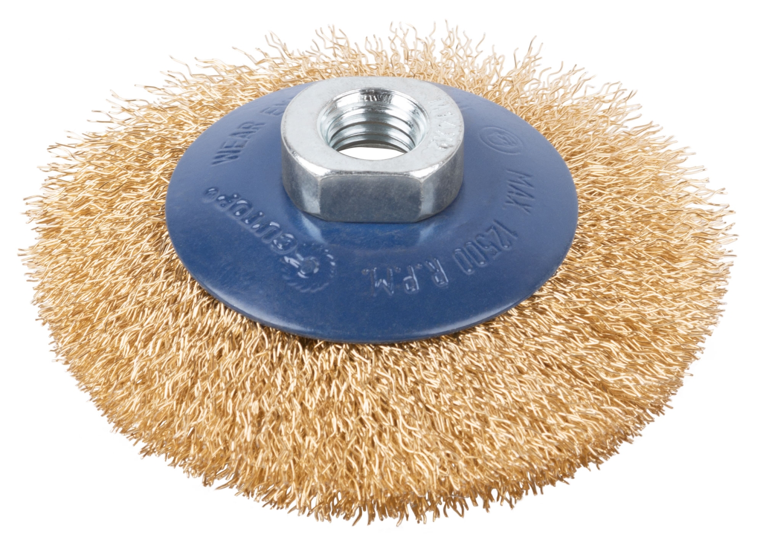 Корщетка-колесо, со штифтом, стальн.латунир.волнист.проволока 100 мм