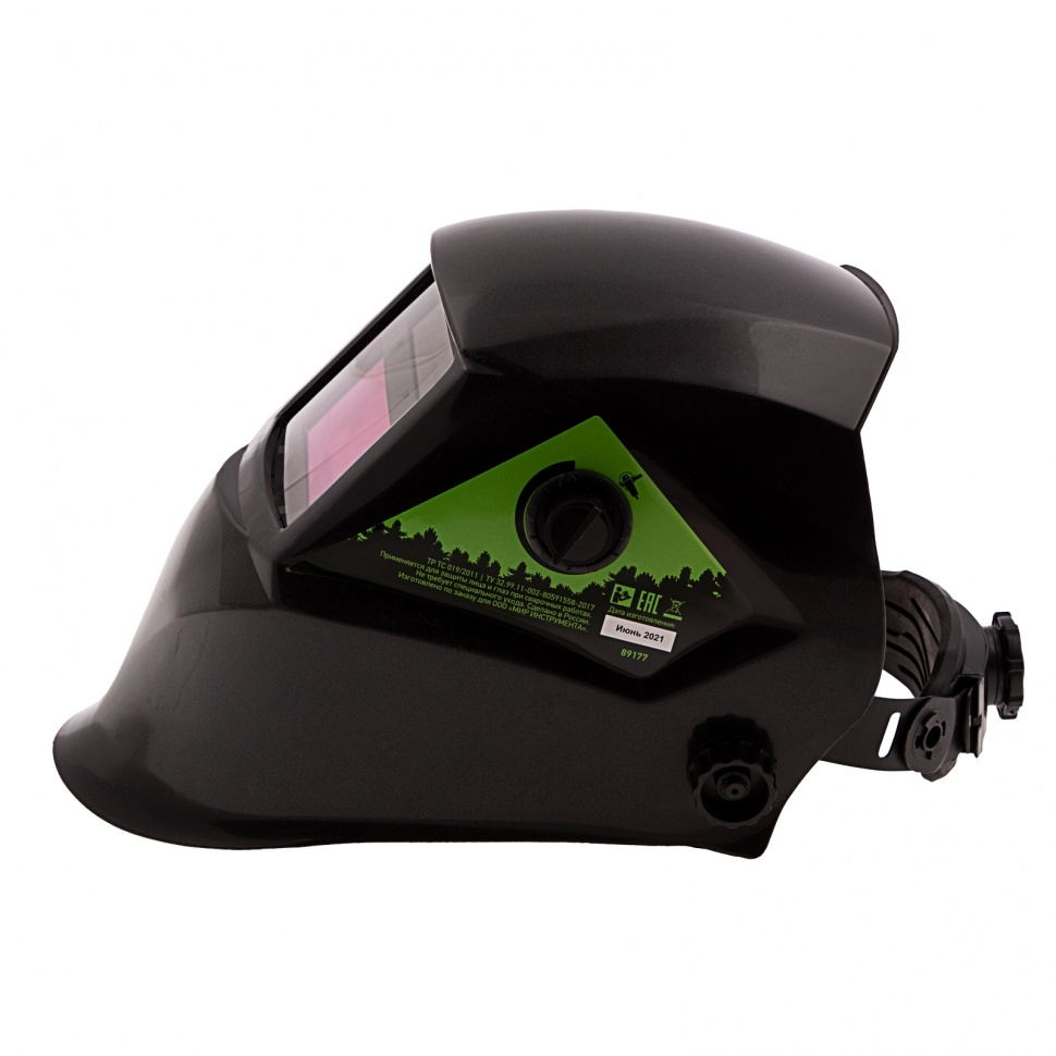 Защитный лицевой щиток, или маска сварщика, Сибртех Ф5 89177 с автозатемнением, упакованный в картонную коробку, закрывает глаза, лицо и шею мастера от света дуги, искр, ультрафиолета и горячих брызг. Предохраняет также от ожогов вследствие высоких температур во время сварочных работ.