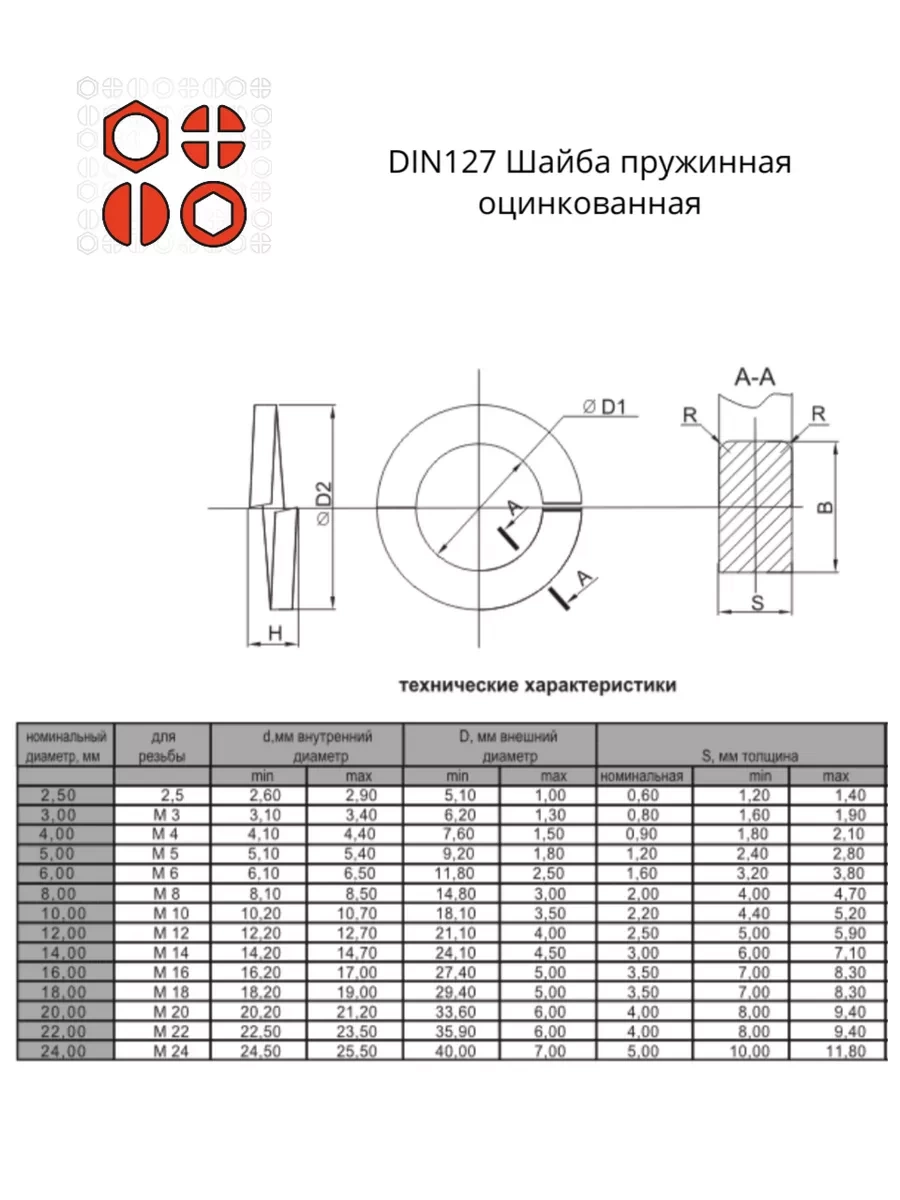 | Шайба пружинная М4,5,6,8,10,12 ОЦ DIN127 (по 50 шт.) | 11645 | 1 шт. |