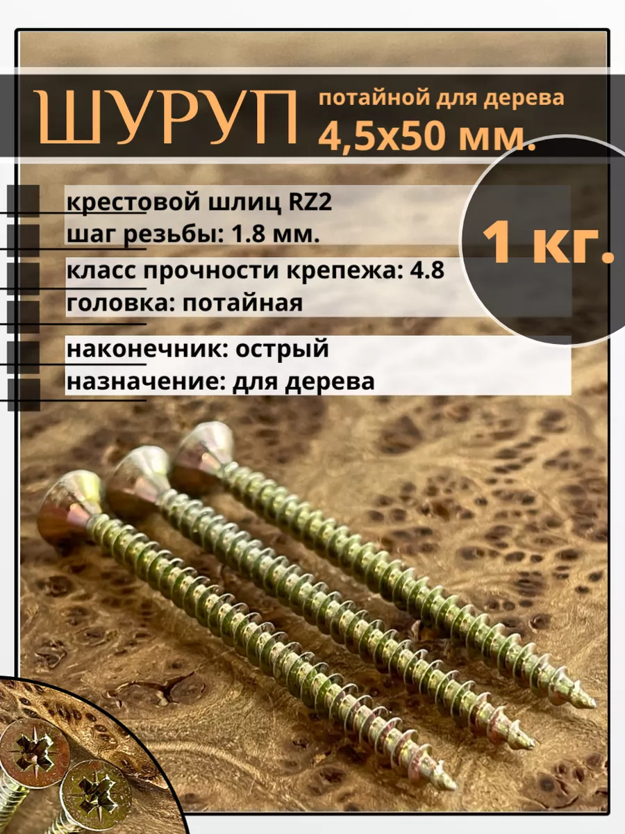 Шуруп саморез потайной для дерева 4,5х50 мм, желтый цинк, 1 кг.