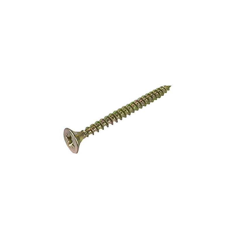 представляет собой стержень с головкой и острым наконечником. Универсальность проявляется в конструкции и области применения. Назначение шурупа — стягивать, скреплять между собой элементы: деревянных, древесностружечных и гипсокартонных плит, из тонкого листового металла. Он аккуратно и быстро вкручивается в материал без предварительного сверления, обеспечивая надежное соединение с основой. Крепежное изделие изготовлено из оцинкованной стали с дополнительной пассивацией. Саморез имеет желтый цвет. Его классическая конструкция включает заостренный цилиндрический стержень с винтовой нарезкой по всей длине, а также потайную головку с крестообразным шлицем PZ. Этот элемент служит для передачи крутящего момента от инструмента – отвертки, шуруповерта при закручивании или выкручивании крепежа.