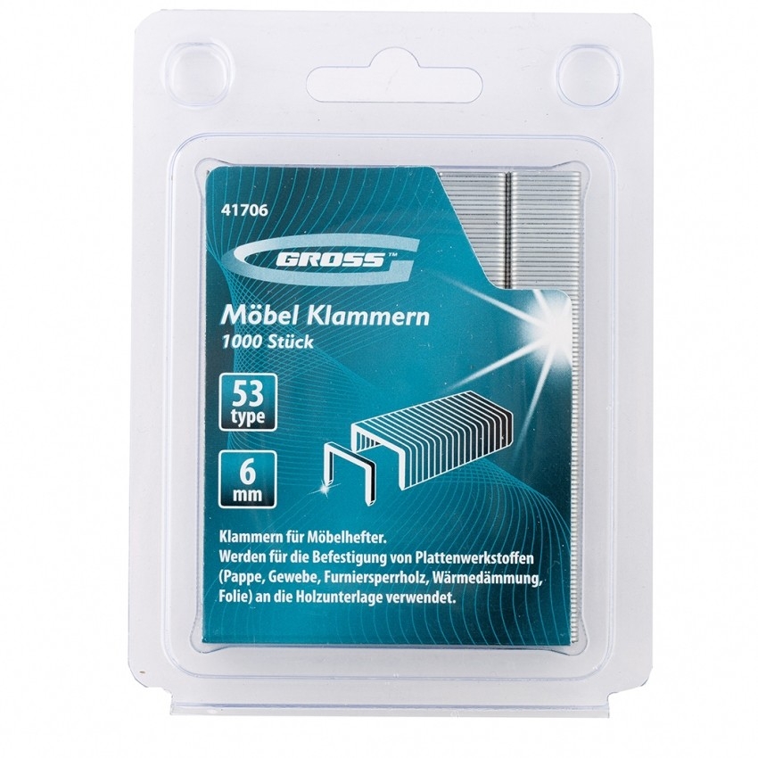 Усиленные скобы Gross 41706 размером 6 х 11,4 х 0,75 мм, тип 53, 1000 шт. в упаковке, предназначены для скрепления листовых материалов с помощью мебельного степлера. Позволяют зафиксировать картон, фанеру, ткань в ходе проведения облицовочных или ремонтных работ.