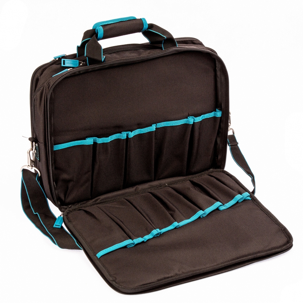 Сумка для инструмента предназначена для переноса и хранения ручного инструмента, документов формата А4, а также ноутбука с диагональю экрана до 15.Множество удобных карманов и прижимных резинок позволяют быстро устанавливать и фиксировать инструменты в сумке.Сумка оснащена удобными рукоятками для переноски, а также наплечным ремнем.Длина сумки 410 мм.