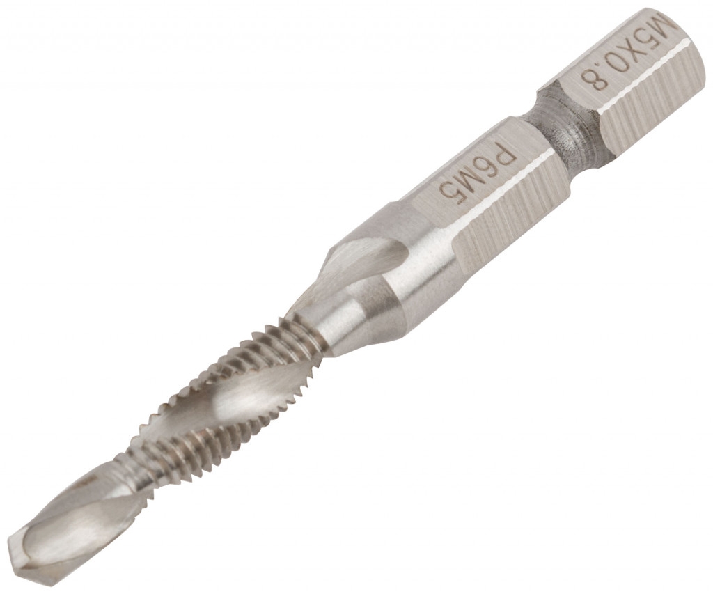 Сверло-Метчик комбинированное метрическое. Для сверления отверстий и нарезания резьбы в легированных и нелигированных сталях, цветных металлах и чугуне. Шлифованный профиль, правостороннее, метрическая резьба. Шестигранный U-образный хвостик. Материал: быстрорежущая (HSS) сталь P6M5. Упаковка : блистер.