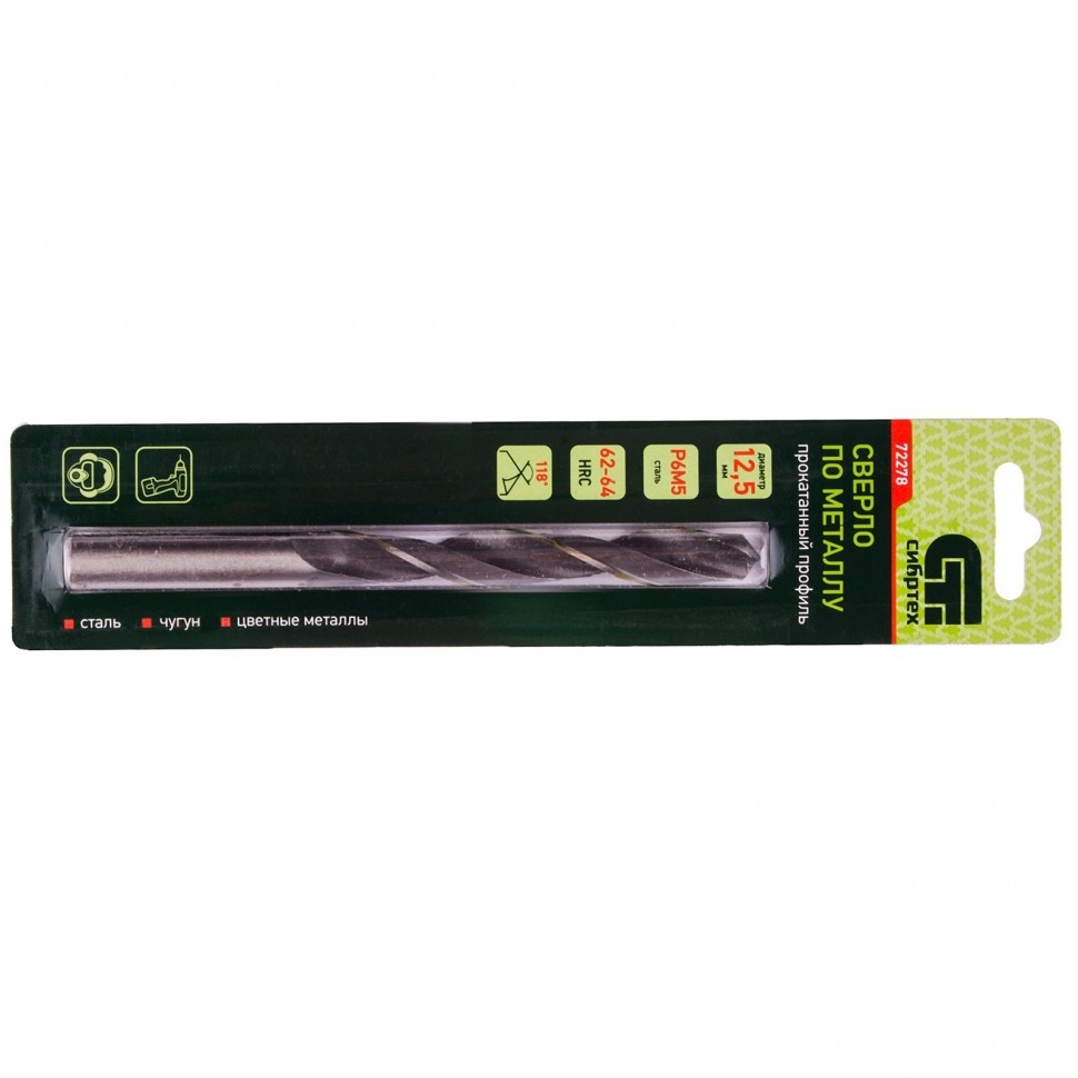 Сверло по металлу Сибртех 72278 из стали P6M5 имеет угол заточки 118 градусов и позволяет получать отверстия диаметром 12,5 мм в черных и тяжелых металлах, в том числе стали, чугуне и твердой бронзе. Сверло отличается наиболее выгодной стоимостью по сравнению с другими моделями из стали P6M5. Используется для монтажно-сборочных работ, будет полезно в быту. Сверло изготовлено из быстрорежущей стали, легированной вольфрамом и молибденом, поэтому устойчиво к динамическим нагрузкам и перегреву.