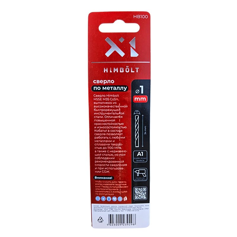 Сверло по металлу с кобальтом 5% P6M5K5 1,0 мм HIMBOLT 2 шт.блистер