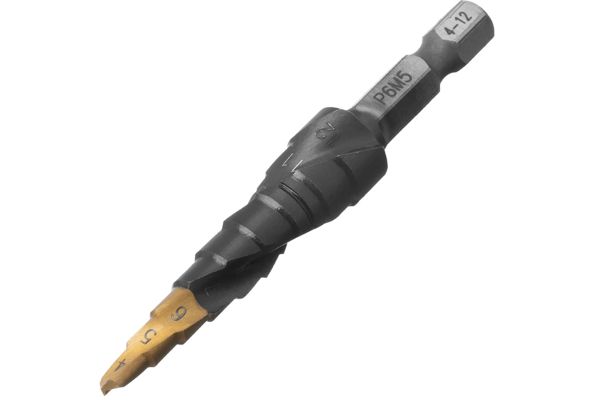 Сверло ступенчатое 4-5-6-7-8-9-10-11-12 мм,Р6М5,шестигр.хв.Denzel