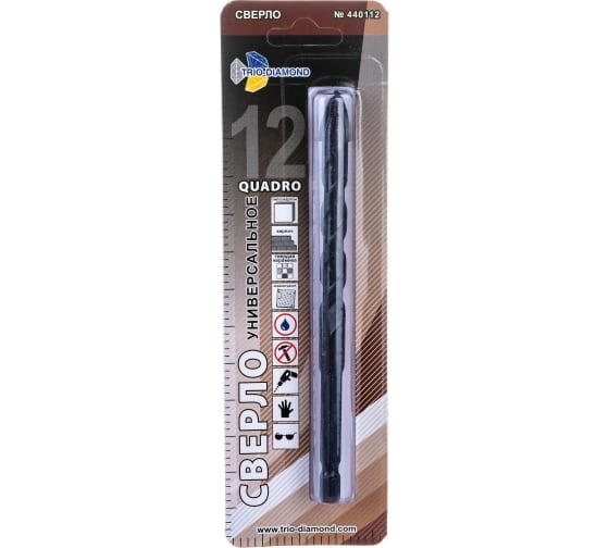 Сверло универсальное квадро TRIO-DIAMOND 440112 служит для работы с шуруповертом, дрелью в безударном режиме. Подходит для сверления керамогранита, твердой керамики, кирпича, гипсокартона. Сверление необходимо проводить с охлаждением сверла и места сверления водой. Количество режущих граней - 4 шт.