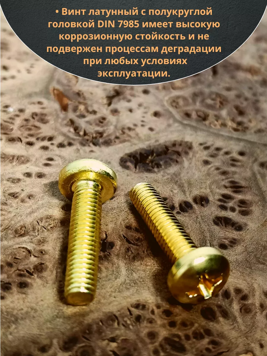 Винт латунный DIN 7985 имеет скругленную цилиндрическую головку (полусферу) со шлицем «крест» Phillips (форма H) или Pozidriv (форма Z) и стержень с резьбой по всей длине. Основное назначение крепежа – крепление деталей из латуни, бронзы, никеля, меди и пластмассы в различных приборах и механизмах. Изготовлен из латунного сплава высокого качества, который благодаря оптимальному процентному содержанию меди и добавок легко поддается пластической деформации, легок и прочен. Латунный крепеж невосприимчив к растворам многих органических кислот, соленой воде и влиянию низких температур.Винт из латуни наиболее востребован в энергетике, приборостроении и электронике, где высоко ценится не только за исключительную стойкость к ржавлению, но и за магнитную пассивность. Благодаря декоративному внешнему виду используется при сборке мебели, выставочных стендов и крепления табличек. Имеет неограниченный срок службы внутри и снаружи помещений. Сохраняет прочность при низких температурах.