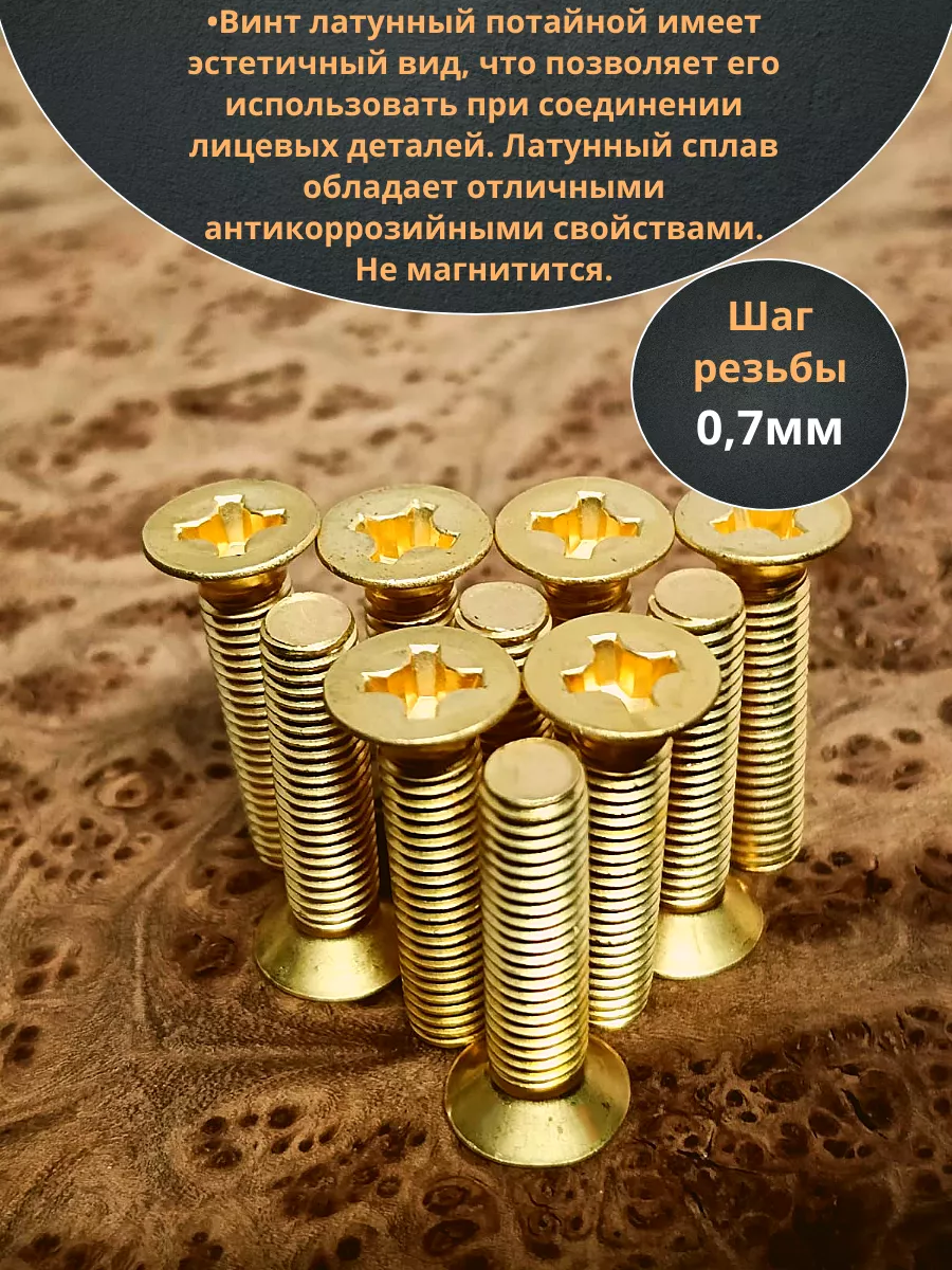 Винт с потайной головкой и крестообразным шлицем, латунный DIN 965 (ISO 7046) - крепежное изделие из высококачественного сплава с оптимальным сочетанием пластичности и прочности. Он имеет полную стандартную метрическую резьбу от М1,6 до М10, его длина (измеряется с головкой) находится в пределах 3-40 мм. Применяется для создания разъемного резьбового соединения деталей и элементов конструкций из латуни, меди, латунированной стали, пластиков, древесины. Винт потай крест из латуни обладает повышенной стойкостью к коррозии и влиянию сильноагрессивных сред. Нагрузка на разрыв составляет 300-440 Н/мм², что сопоставимо с аналогичными стальными метизами нормальной прочности. Стабильность свойств гарантирована даже при критически низких температурах. Магнитная пассивность и электрическая проводимость латуни обуславливают его применение при сборке электроники, электротехники и приборов. Винт латунный потайной крестовый подлежит установке в резьбовое отверстие базового элемента.
