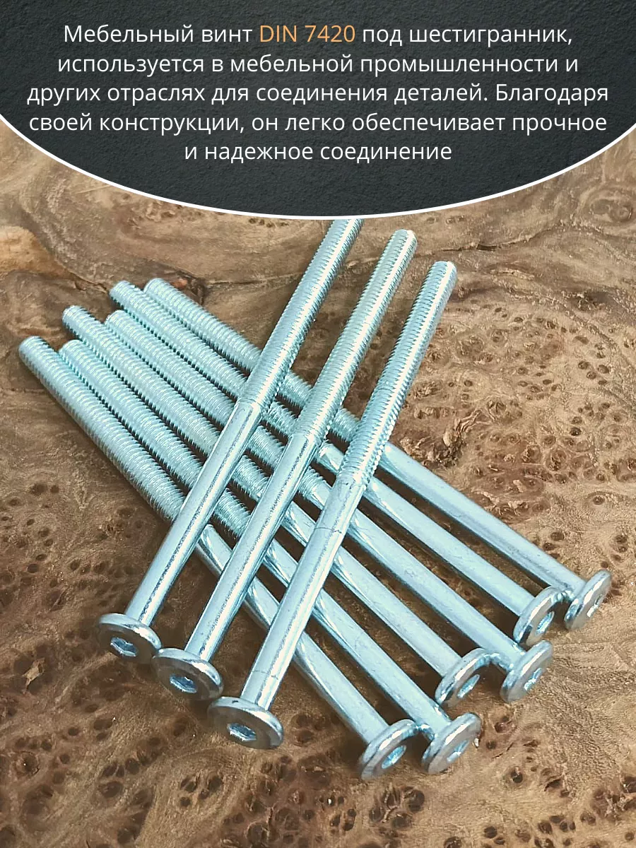 Мебельный винт плоский (оцинкованный) с шестигранным углублением предназначен для сквозного скрепления элементов корпусной и мягкой мебели, а также лестничных и других деревянных конструкций. С обратной стороны соединяемых деталей на резьбовой конец стержня накручивается гайка с шайбой, затем крепеж затягивается угловым ключом типа имбус. Эстетически привлекательное крепление создается при совместном использовании с гайкой Эриксона. Мебельный крепеж «винт – гайка» применяется там, где требуется высокая прочность соединения на растяжение и на срез, например, при сборке диванов, кроватей, школьных или офисных шкафов, столов, стульев. Для предотвращения ослабления винтовой пары может использоваться с врезной гайкой. Винт мебельный с плоской головкой не имеет острых углов, что обеспечивает безопасное пользование мебелью. Конусный подголовник и большая часть шляпки заглубляются в деревянное основание при установке. Шестигранный шлиц позволяет от руки при помощи имбусового ключа затянуть крепеж до нужного предела.
