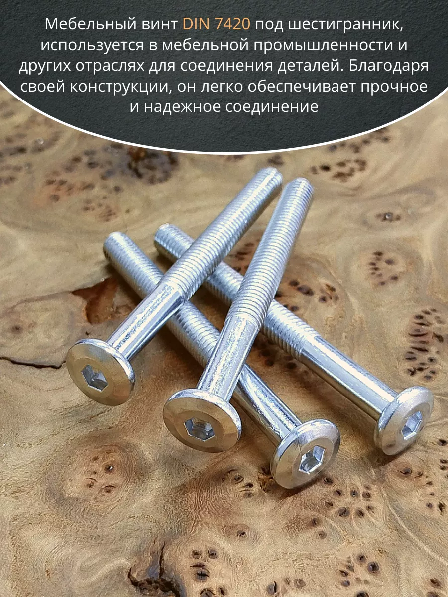 Мебельный винт плоский (оцинкованный) с шестигранным углублением предназначен для сквозного скрепления элементов корпусной и мягкой мебели, а также лестничных и других деревянных конструкций. С обратной стороны соединяемых деталей на резьбовой конец стержня накручивается гайка с шайбой, затем крепеж затягивается угловым ключом типа имбус. Эстетически привлекательное крепление создается при совместном использовании с гайкой Эриксона. Мебельный крепеж «винт – гайка» применяется там, где требуется высокая прочность соединения на растяжение и на срез, например, при сборке диванов, кроватей, школьных или офисных шкафов, столов, стульев. Для предотвращения ослабления винтовой пары может использоваться с врезной гайкой. Винт мебельный с плоской головкой не имеет острых углов, что обеспечивает безопасное пользование мебелью. Конусный подголовник и большая часть шляпки заглубляются в деревянное основание при установке. Шестигранный шлиц позволяет от руки при помощи имбусового ключа затянуть крепеж до нужного предела.